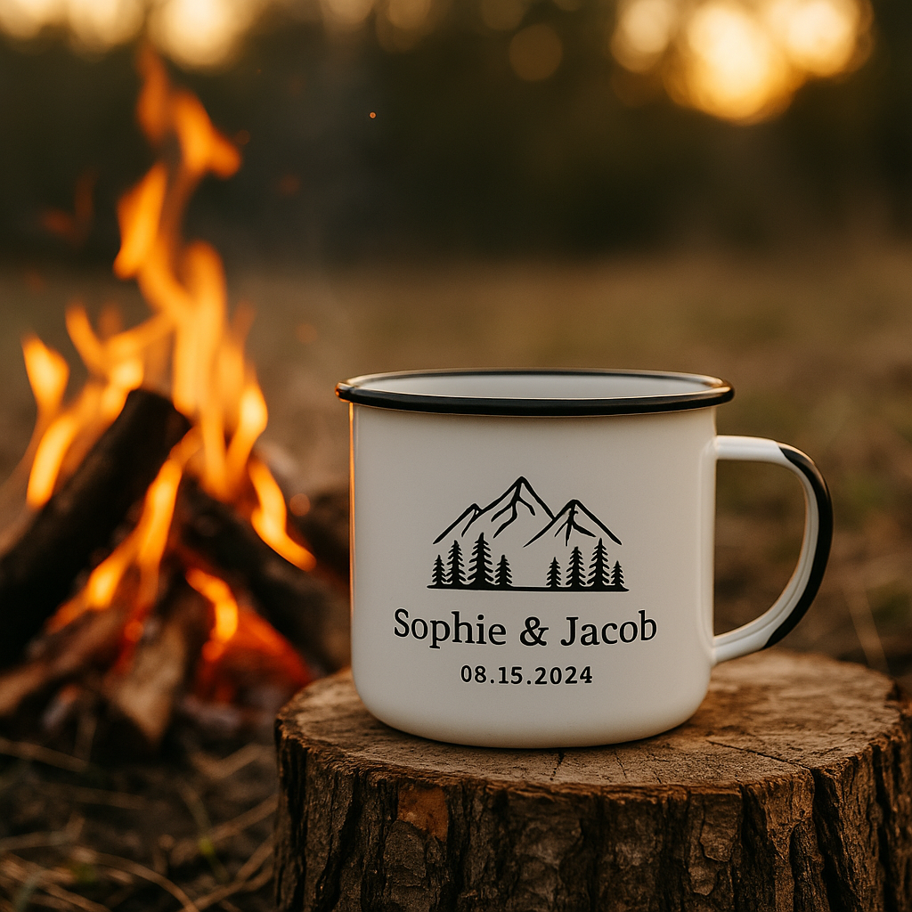 Ceramic & enamel mugs with themes like camping, nature, family milestones and daily rituals. Each mug can be customized with names, important dates or short messages.